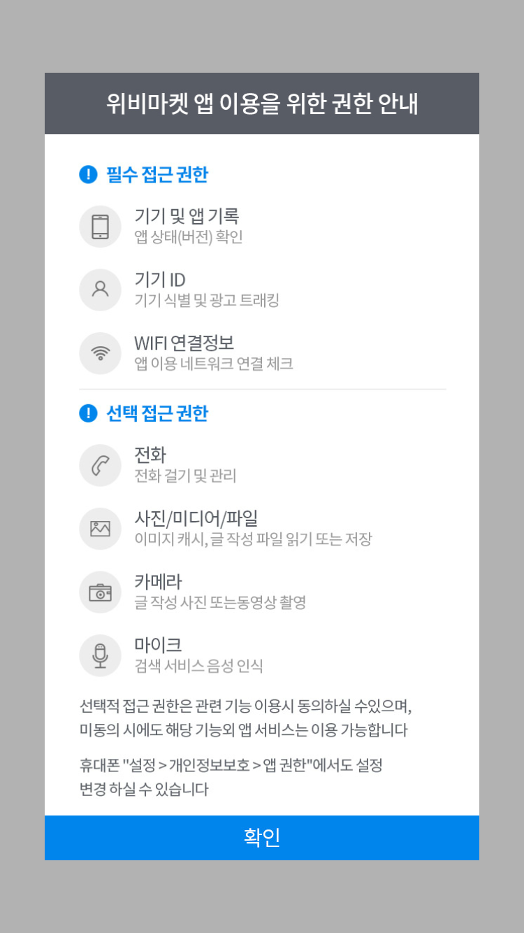2017년 3월23일부로 시행된 정보통신망법 제 22조의2(접근 권한에 대한 동의)에준수하여 앱 서비스 이용 시 꼭 필요한 접근권한을 아래와 같이 안내드립니다.
