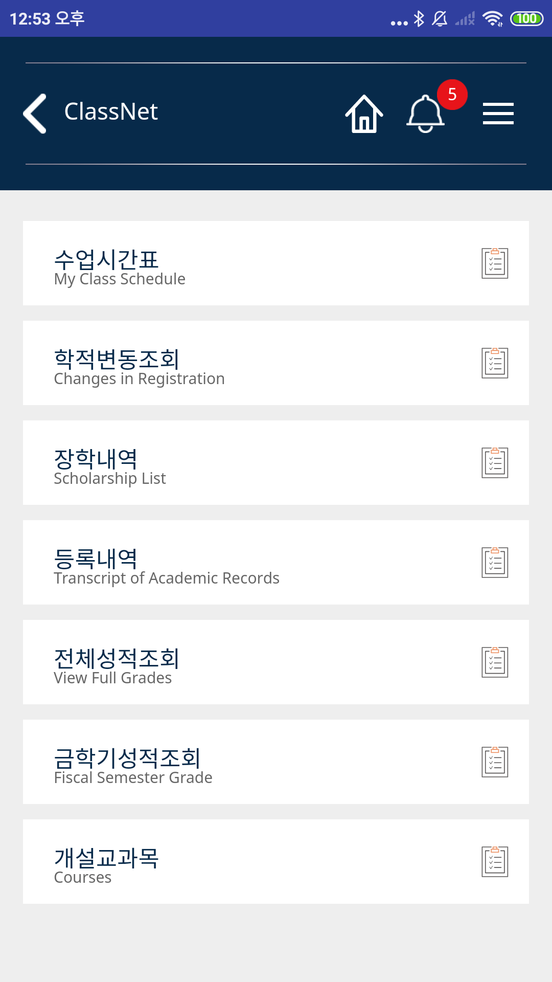 학사포털 – 수업시간표, 학적변동조회, 장학내역, 등록내역, 전체성적조회, 금학기성적조회,개설교과목