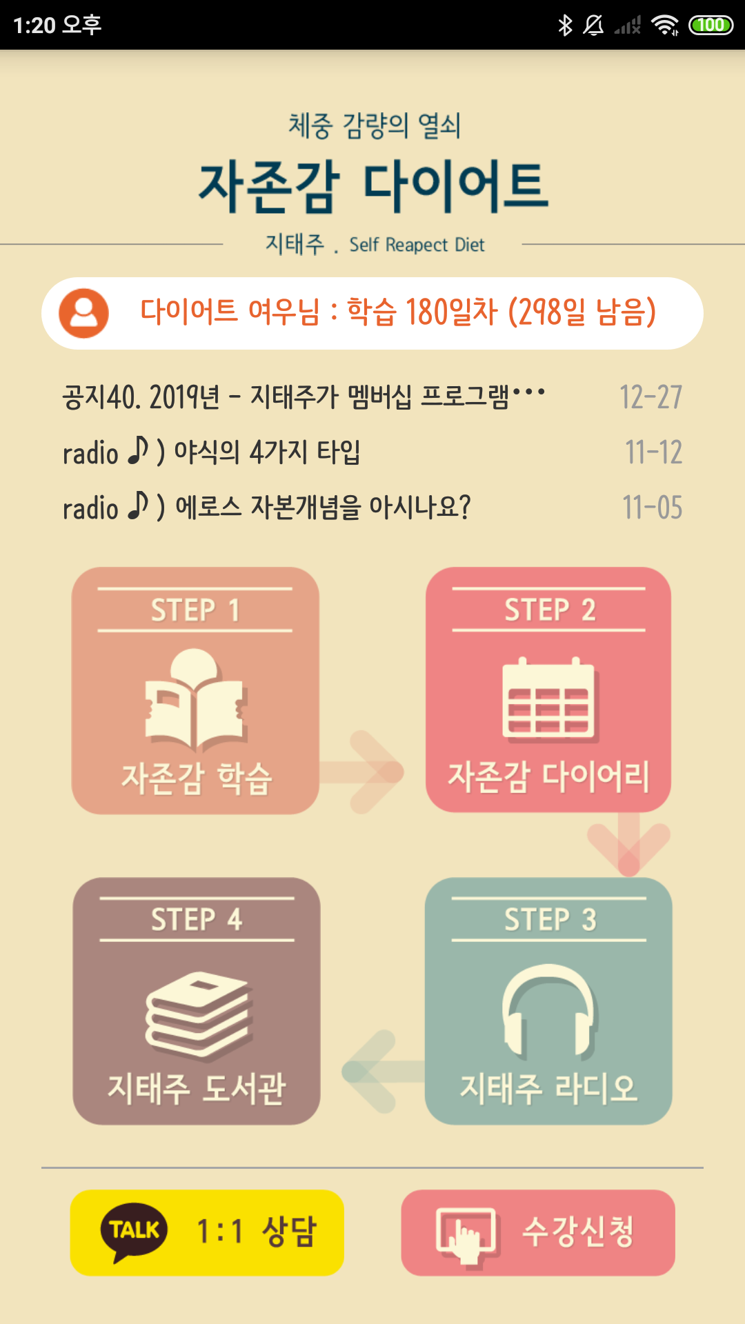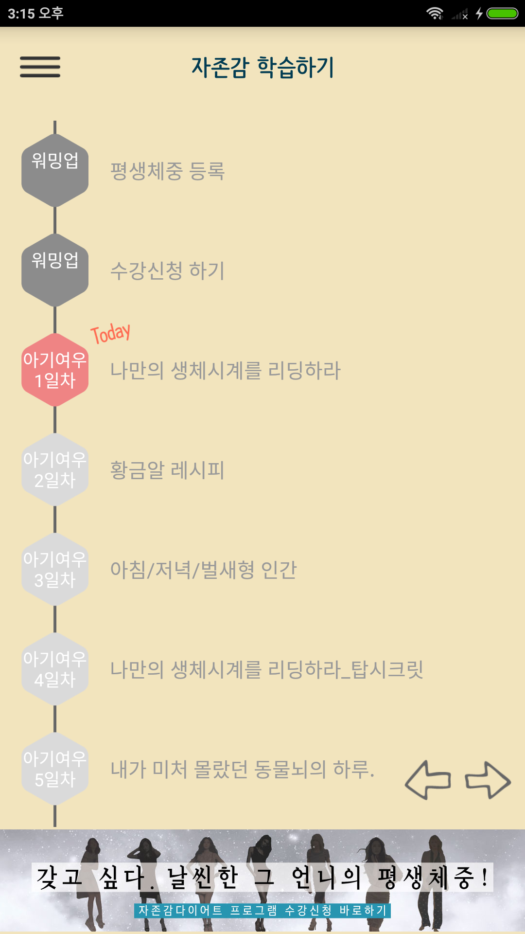 여기에 자존감미션을 바탕으로 학습컨텐츠가 제공됩니다. 이야기의 형태로 제공되는데, 365일 다이어트하는 ‘희진’이라는 여자와 다이어트 하지 않아도 늘 날씬한 ‘여우’라는 여자의 일상을 보여줍니다. 이 둘은 같은 회사 동료로, 같은 장소, 시간, 상황 속에서 어떻게 다르게 생각하고 행동하는지 보여줍니다. 때문에 희진이의 이야기를 통해 ‘어쩌면 나도?’하면서 공감하는 것과 동시에 스스로의 생각과 행동을 되돌아보며 인지하게 되고, 여우의 이야기를 통해 ‘아~ 그래서 여우는 평생 날씬하게 사는구나!’하면서 배우고 닮아가려고 하는 거울뉴런효과가 발동하면서 실제 행동을 유도합니다.