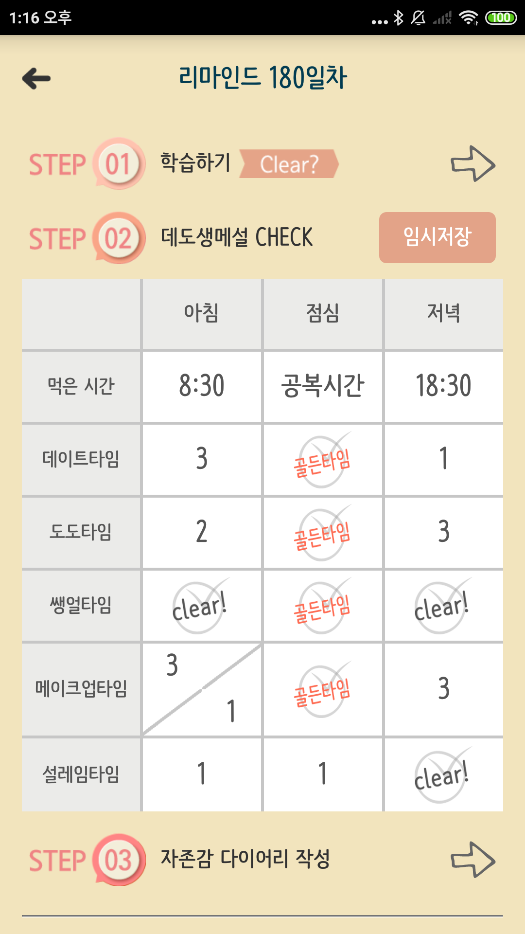 이를 바탕으로 설계된 다이어리는 새로운 방법으로 문제를 제시합니다. 하루를 16칸으로 나눴고, 각 칸마다 점수를 매기는 방법이 다릅니다. 때문에 각 칸에 점수를 부여하기 위해 살이 빠질 수밖에 없는 선택과 행동을 하게 됩니다.